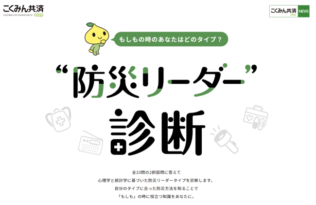 こくみん共済 coop〈全労済〉(全国労働者共済生活協同組合連合会 代表理事 理事長:廣田 政巳)とディグラム・ラボ株式会社(代表取締役社長:木原 誠太郎)は、当会が推進する「これからの防災・減災プロジェクト」の一環として、もしも災害が起こった時「自分はどんな行動を取るべきか」、一人一人の性格にあった、防災リーダータイプを診断できるコンテンツ『防災リーダー診断』を、8月31日(水)から無料提供します。