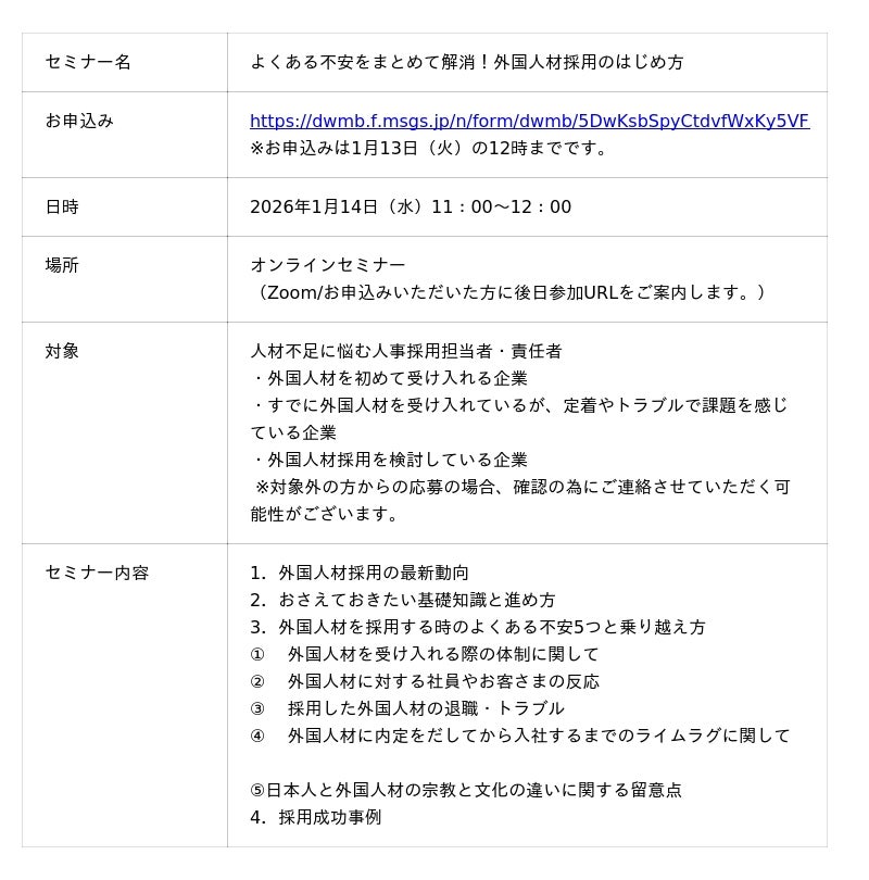 1月14日(水)無料オンラインセミナー開催「よくある不安をまとめて解消!外国人材採用のはじめ方」