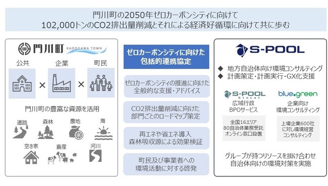 本提携は、門川町の持続可能なまちづくりを目的に、ゼロカーボンシティ実現に向けた推進計画策定および実行の支援を中長期的に行ってまいります。具体的には CO2排出量等の算定や削減に向けたロードマップの策定、町民及び町内事業者への環境活動に対する普及活動等を行ってまいります。