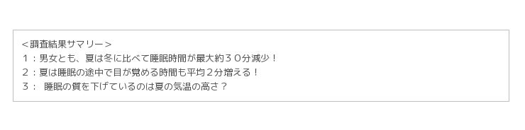やはり暑さが原因!?夏は冬に比べて睡眠時間が約30分減少!就寝中に目覚める“中途覚醒時間”も冬より2分長くなることが判明!