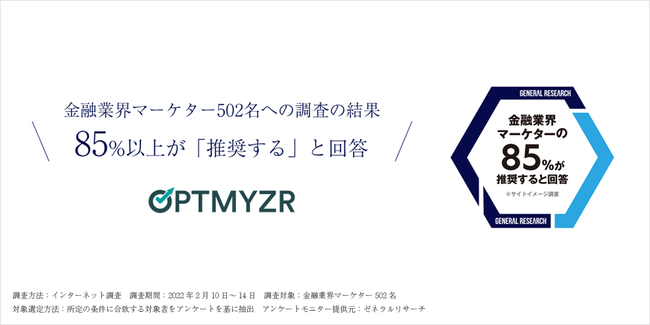 株式会社アドフレックス・コミュニケーションズ(本社:東京都港区、代表取締役:桑畑治彦、以下アドフレックス)はゼネラルリサーチ株式会社が実施したインターネット調査において、金融業界マーケターの85%が弊社の提供するリスティング広告最適化AI「Optmyzr(オプティマイザー)」を推奨するとの回答が得られましたのでお知らせします。
