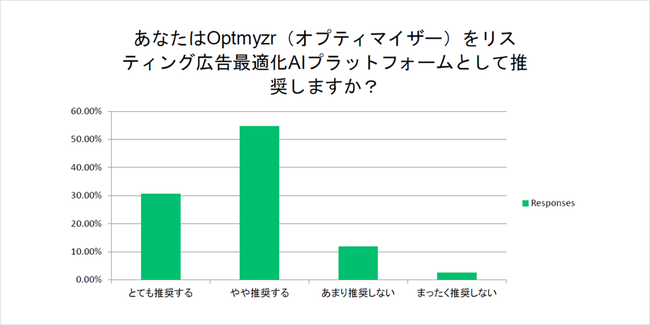今回の調査は金融業界のマーケター502名を対象に実施され、「Optmyzr(オプティマイザー)をリスティング広告最適化AIプラットフォームとして推奨しますか?」という問いに対して、「とても推奨する」が30.68%、「やや推奨する」が54.78%と全体の85%が推奨すると回答しました。