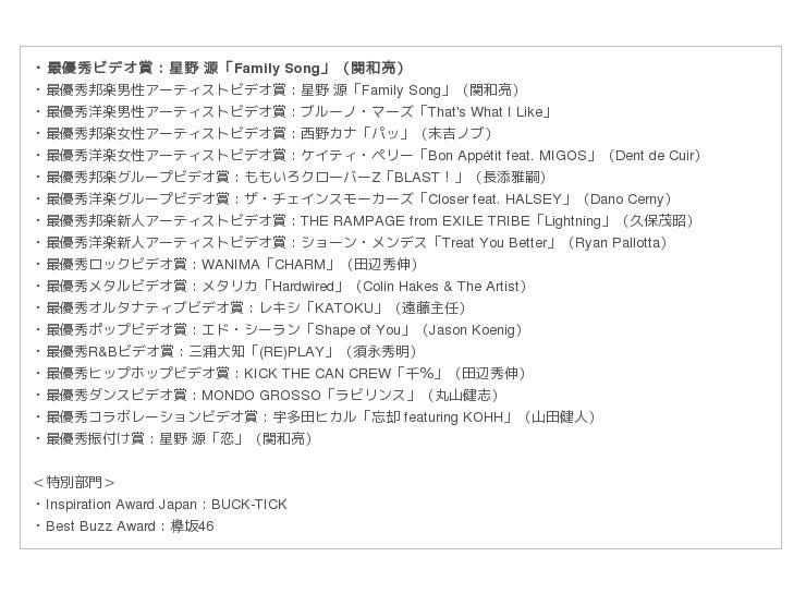 星野 源3冠!今年のミュージックビデオの頂点に輝いたのは星野 源「Family Song」〜優れたミュージックビデオを表彰する音楽アワード「MTV VMAJ 2017」〜