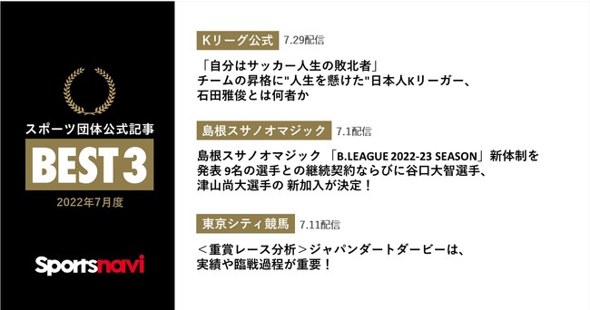 スポーツナビでは毎月、公式情報記事配信において最も印象的だった記事3つを選定し、「スポーツ団体公式記事 月間ベスト3」と称して表彰させていただいております。