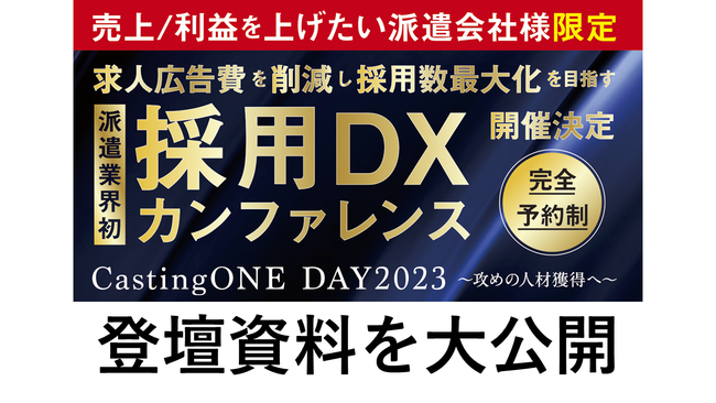 株式会社CastingONE(キャスティングワン、本社:東京都千代田区、代表取締役:野澤 怜司)は、2023年1月27日(金)に開催したオフラインイベント「CastingONE DAY 2023 〜攻めの人材獲得へのシフト〜」の事例紹介パートの登壇資料を公開したことをお知らせいたします。資料は3月31日(金)〜4月28日(金)までの約1ヶ月間限定で公開する予定です。