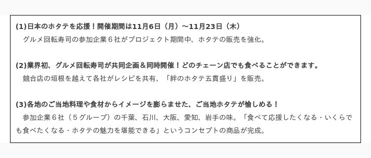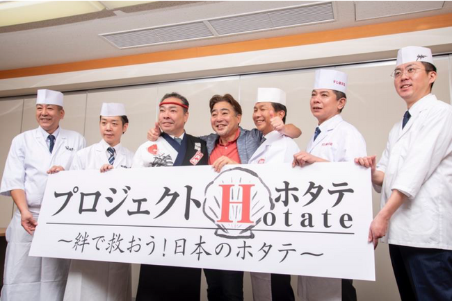 この現状に危機感を募らせた全国各地のグルメ回転寿司店は、問題解決のために業界では初の試みとなる競合6社(5グループ)による共同プロジェクト「プロジェクトH(HOTATE)〜絆で救おう!日本のホタテ」を立ち上げることにしました。ホタテ生産者と回転寿司企業との絆、回転寿司企業同?が手に手を取り合った絆、回転寿司店とお客様の絆、ホタテ生産者とホタテを応援するお客様との絆。あらゆる絆によって危機を乗り越えることを目的にプロジェクトを発足いたしました。