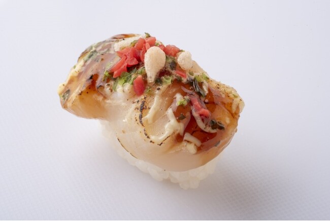 大阪のソウルフード”たこ焼き”をホタテ寿司で表現しました。