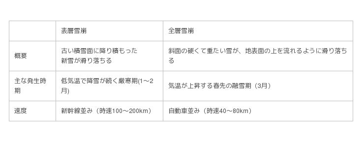 また、気温が上昇して積もった雪が溶け始める融雪期 (おおむね3月以降)には、大量の雪が自動車並みの速度(時速40〜80km)で滑り落ちる「全層雪崩」が起きやすい傾向があります。