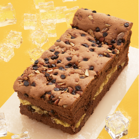 チョコレートカステラ生地に、完熟バナナのフィリングと、フランス産チョコレートを使用した特製のチョコレートソースをたっぷり練り込みました。トッピングのチョコレートチップの風味とローストアーモンドのサクサクとした食感と、優しい口当たりのカステラ生地とのコントラストも楽しく、濃厚でコクのある味わいがあとをひきます。
