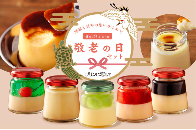 【プリンに恋して オンラインショップ】にて9月1日(木)10時より敬老の日セット2種の販売を開始いたします。新発売のシャインマスカットプリンが入ったこの時期だけの敬老の日セット各種には、プリンに恋してオリジナルの【敬老の日 オリジナル掛け紙】をつけてお届けいたします!オリジナルデザインの掛け紙には長寿の願いをこめて和柄の “紗綾形”や“ツル”、“カメ”をあしらいました。老若男女問わず愛されるプリンは敬老の日の贈り物にぴったりです。※のしに名入れサービスは行っておりません。予めご了承下さい。