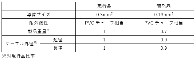 その結果、本製品は、PVCチューブと同等の耐外傷性を維持しながら、当社現行品に比べ30%の軽量化と10%の細径化を実現しています。