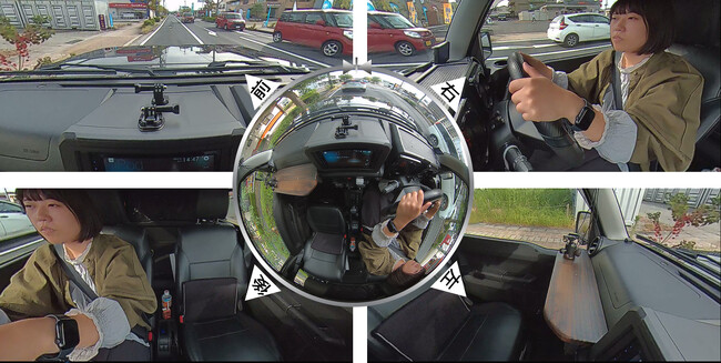 360°全方位カメラ:水平視野角360° + 垂直視野角220° パノラマレンズ(前後・左右・車内の映像を全方位で記録)