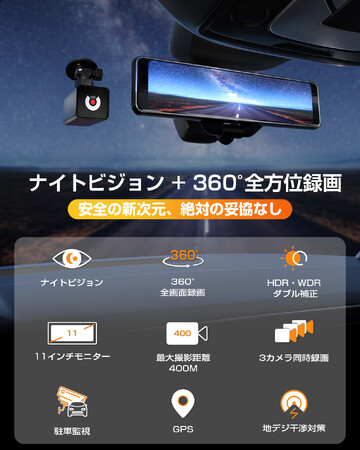AKY-NV-360 = 「360°全方位記録」+「フルカラーナイトビジョン」+「11インチ・デジタルミラー」+「SONY製IMX307搭載リヤカメラ」。いざという時、あなたの強い味方になる!