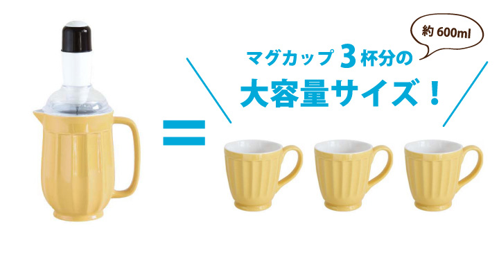 家族使いや、たくさん飲みたい人には嬉しい、一般的なマグカップ約3杯分(約600ml)が入るビッグサイズ!