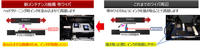 新規メンテナンス機構では、プリントヘッドのノズル面に付着した不要なインク滴の除去率を高めた布ワイパを採用。従来の掻き取り式のゴムワイパと比べ、不要なインク滴をしみ込ませる機構のため、プリントヘッド周りなどへのインクの飛散を低減します。ヘッドやキャップ周りのメンテナンス頻度が減ることで、日々のお手入れが簡単になり、マシンを常に最適な状態に維持することができます。