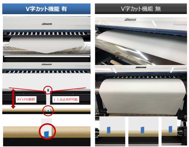 新機能「V字カット機能」でメディアをV字にカットすることで、紙管へ巻き付ける際のテープ止めを1点で行うことができます。メディアの中心を的確に紙管へ取り付けることができ人為的なミスを軽減し搬送ズレの抑制になります。またメディアの端材を使って1点止めすることでメディアの節約にもなります。ボタン一つで「V字カット」または従来のカットの2種類の方式から選択できます。
