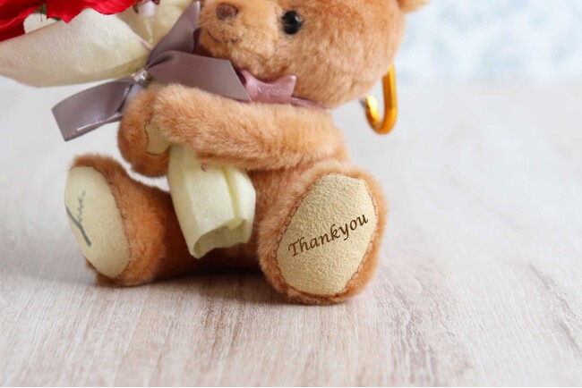 テディベアの左足に10文字までのオリジナルメッセージをプリントすることも可能です。さらに特別感をお求めの方におすすめです。