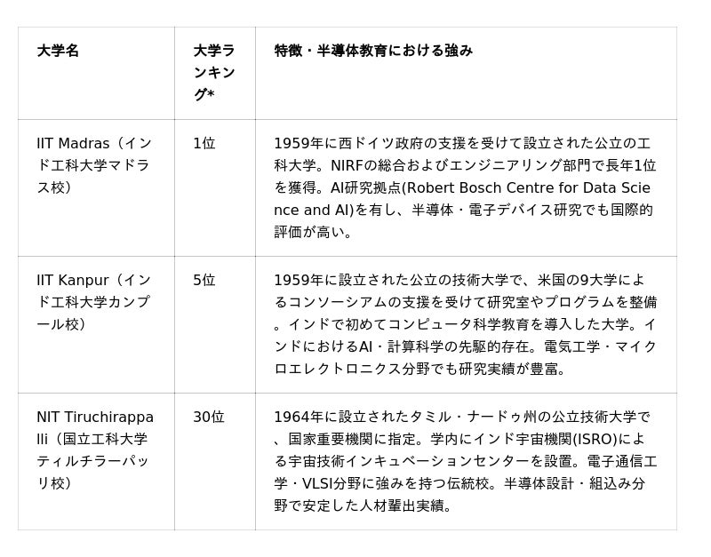 Tech Japanは、高度インド人材に特化した採用プラットフォーム「Talendy」を通じて、IIT(インド工科大学)をはじめとするインドのトップ大学25校以上と連携しています。これにより、「機械×IT」「電気×IT」「材料×IT」といった、半導体産業と親和性の高いデュアルスキル人材へのアクセスを提供しています。[表1: https://prtimes.jp/data/corp/46994/table/62_1_19d042597ce97c69a1b128f878ed6fb0.jpg?v=202604011045 ]