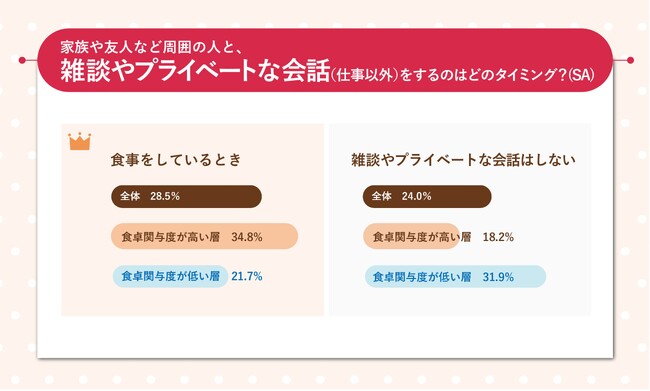 日頃の会話シーンについて調査したところ、食卓関与度が高い層と低い層をそれぞれで比較すると、1位の「食事をしているとき」と回答した割合は、食卓関与度が高い層は34.8%、食卓関与度が低い層は21.7%という結果になりました。一方で、「雑談やプライベートな会話はしない」は、食卓関与度が高い層は18.2%、食卓関与度が低い層は31.9%という結果になりました。