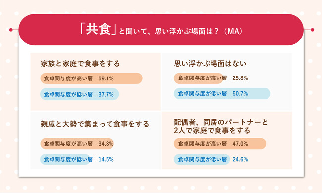 上記の調査結果を食卓関与度別に比較したところ、食卓関与度が高い層ほど、思い浮かぶ場面の選択数が多く、1位の「家族と家庭で食事をする」を選択したのは、食卓関与度が高い層が59.1%、食卓関与度が低い層で37.7%という結果でした。尚、2位の共食と聞いて「思い浮かぶ場面はない」という回答については、食卓関与度が高い層は25.8%しか選択していない一方、食卓関与度が低い層は、50.7%も選択しており、両者では「共食」へのイメージや理解がかなり異なることがわかりました。