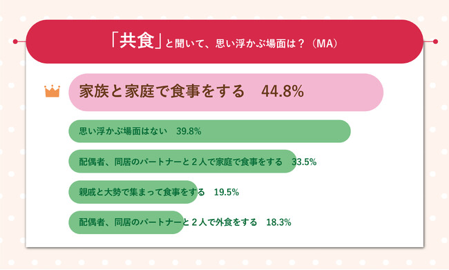 「共食」と聞いて、思い浮かぶ場面を調査したところ、1位は「家族と家庭で食事する(44.8%)」、2位は「思い浮かぶ場面はない(39.8%)」、3位は「配偶者、同居のパートナーと2人で家庭で食事をする(33.5%)」という結果になりました。この結果から、「共食」という言葉はまだあまり知られていないものの、「家族や同居しているパートナーとの家での食事」が「共食」であると多くの人に捉えられていることがわかりました。