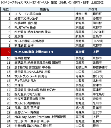 「2023 トラベラーズチョイス ベスト・オブ・ザ・ベスト ホテル」『MIMARU東京 上野NORTH』旅館(B&B、イン)部門 日本9位に選出