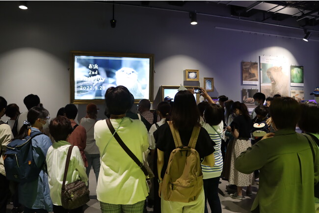 今年は、メイン会場となる3階FOYERには50人以上が集まり、大型モニターに映し出されるコツメカワウソたちがご飯を食べている様子や飼育員がプレゼントを渡す様子など、飼育員がリアルタイムで撮影した中継映像を見ながら「お浜」の誕生日をお祝いしました。