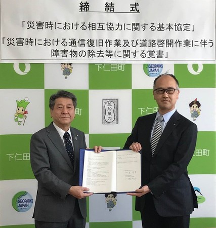 下仁田町(町長:原 秀男)と東日本電信電話株式会社 群馬支店(支店長:橋本 寿太郎、以下「NTT東日本」)は、災害時に備えた「災害時における相互協力に関する基本協定」および「災害時における通信復旧作業及び道路啓開作業に伴う障害物の除去等に関する覚書」を締結しました。これは、大規模災害に備えた相互協力による通信中断の早期復旧に向けた体制の確立、および昨今の台風等強力な暴風雨によって引き起こされる電柱や樹木の倒壊等障害物発生に伴う通信中断や道路の通行規制の長期化に備え、早期の障害物除去体制を確立し、地域の皆さまへの迅速な通信手段確保および道路開放へ向けた連携強化を目的としています。本協定等の締結に基づき下仁田町とさまざまな対策を推進し地域の防災力向上に取り組んでいきます。