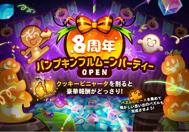 8周年を迎え、豪華な特典が満載の期間限定イベント「8周年パンプキンフルムーンパーティー」が開催されます。プレイを通じて「クッキーピニャータ」を集めて割ると、クッキー/ペット/宝物など様々な報酬が獲得できます。ピニャータから獲得できるパズルのピースを集めて思い出のパズルを完成すると、8周年限定ゼリースキンを獲得することができます。