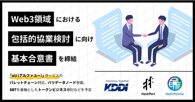 株式会社HashPort(本社:東京都港区、代表取締役CEO:吉田世博、以下グループを総称して「HashPortグループ」)および連結子会社である株式会社HashPalette(本社:東京都港区、代表取締役CEO:林 孝之)は、KDDI株式会社(本社:東京都千代田区、代表取締役社長 CEO:高橋 誠、以下「KDDI」)と、Web3領域における協業に向け検討する旨の基本合意書を締結いたしました。