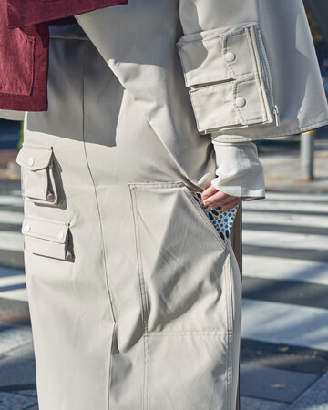 カラーはアイボリー・オリーブ・ネイビーの3色展開。大小さまざまなサイズの全11個のポケットには、スッと取り出せたら便利なスマホやパスケース、手ぶらでもメイク直しに行けるようリップやミラー付きのアイシャドーを忍ばせて。小腹が空いた時のお菓子を隠したり、お気に入りの文庫本を入れたり、使い方は自由自在です。
