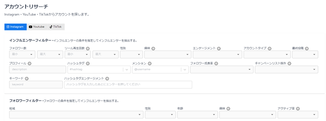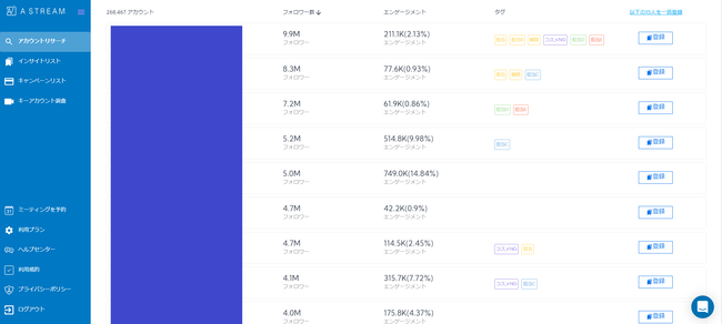 インフルエンサ―マーケティングツールの『A stream』では、上図のように様々なフィルタリングでインフルエンサーを検索することが可能です。