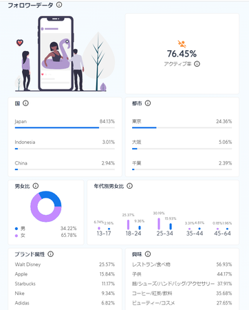 上図は分析項目の一例。その他に、フォロワー数・フォロワーの成長率・エンゲージメント率・いいねの推移・いいねしてくれる人の属性・フォロワーのアクティブ率など、約30以上の分析項目を公開。それらのデータも、リストと共に抽出することが可能です。