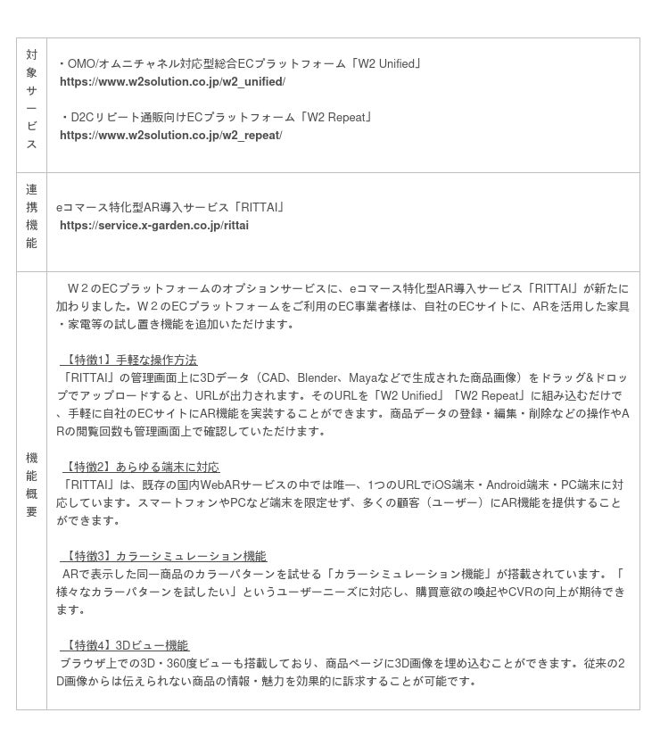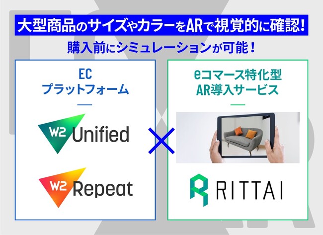 EC事業の「成功」にこだわる最先端ECプラットフォームを展開するW2株式会社(本社:東京都中央区、代表取締役CEO:山田大樹、以下W2)は、自社が提供するOMO/オムニチャネル対応型総合ECプラットフォーム「W2 Unified」、D2Cリピート通販向けECプラットフォーム「W2 Repeat」と、eコマース特化型AR導入サービス「RITTAI」を提供する株式会社x garden(本社:東京都渋谷区、代表取締役:松谷遼、以下x garden)が業務提携したことをお知らせいたします。これによりW2は、W2のECプラットフォームをご利用中・ご検討中のEC事業者様へ、ECサイトへのAR機能のご提案が可能となりました。