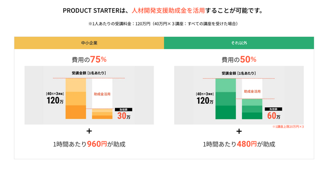 PRODUCT STARTERは、条件を満たせば人材開発支援助成金 事業展開等リスキング支援コースを使用することができます。これにより、PRODUCT STARTERの研修費用を大幅に削減可能です。