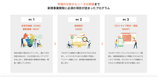 私たちはそんな新規事業立ち上げ時に直面する課題の解決方法をプログラムを通して提供することで、「アイデアをカタチにできる」人材を育成します。