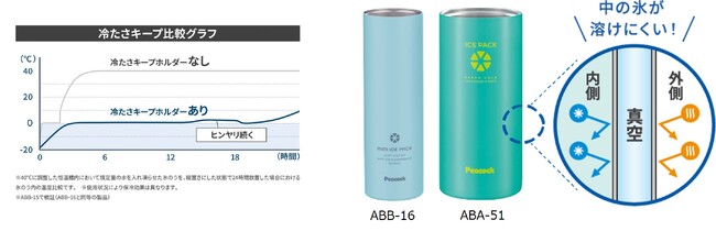 魔法瓶構造の冷たさキープホルダー。魔法瓶として長年培ってきた「真空断熱構造」の技術を応用して開発しました。ホルダーが暑い外気からの熱を遮断することで氷のうの冷たさを長時間キープします。