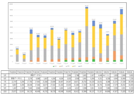 総務省消防庁のデータによると、熱中症により救急搬送人員が年々増加していることが判明しました。令和5年から9月の全国における熱中症による、救急搬送人員の累計は、91467人でした。本調査は調査開始以降、過去最多となった平成30年の95,137人に迫り、過去2番目に多い搬送人員となりました。令和6年も厳しい猛暑が既に予測されており、厚生労働省は「STOP!熱中症 クールワークキャンペーン」を実施し、熱中症対策の呼びかけをしています。