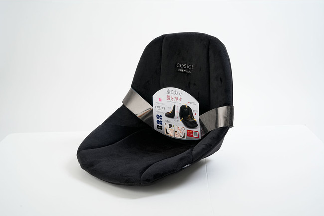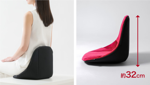 座ると、骨盤を起こすように腰が押され、次に背筋を伸ばすように背中をグッと押されているような感覚になります。姿勢を安定させ腰への負担を軽減します。