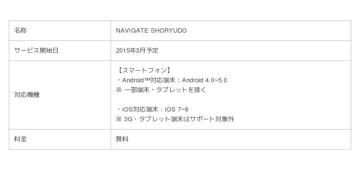 株式会社リクルートライフスタイル(本社:東京都千代田区、代表取締役社長:北村吉弘、以下リクルートライフスタイル)、株式会社トヨタマップマスター(本社:愛知県名古屋市、代表取締役社長:東重利、以下トヨタマップマスター)、中部国際空港株式会社(本社:愛知県常滑市、代表取締役社長:川上博、以下セントレア)は共同で、インバウンド(訪日外国人旅行)に向けた観光サービスなどを提供するおもてなし事業として、スマートフォン向け観光ナビゲーションアプリ「NAVIGATE SHORYUDO(ナビゲート ショウリュウドウ)」を2015年3月より提供することをお知らせいたします。