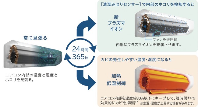 また、一年中、エアコン内部を見張ってエアコンをカビから守る内部クリーン運転の「カビバスター」(*6)も、従来の温度・湿度に加えて「清潔みはりセンサー」で内部のホコリを検知してタイミングよく運転することで効率化を実現しました。