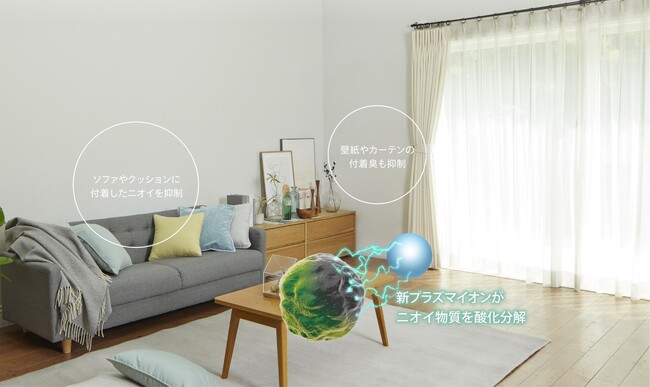 本製品は新たに、お部屋に漂うニオイだけでなく、カーテンやソファなどに付着したニオイを脱臭する機能を搭載し、ニオイ対策を強化しました。