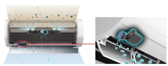 「NEW Premiumプラズマ空清」は、エアコン室内機吹き出し口側に新プラズマイオン発生器を搭載し、繊維に付着するニオイを脱臭する新プラズマイオンを放出します。気流に乗った新プラズマイオンが付着しているニオイ物質を酸化分解します。