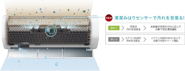 また、エアコン運転中は、お部屋の空気の汚れを見張り、エアコン停止中はエアコン内部の汚れを見張る「清潔みはりセンサー」(*3)を新たに搭載しました。「清潔みはりセンサー」によって、お部屋の汚れに応じて自動で空気清浄運転を行い、エアコン停止中は、エアコン内部の汚れに応じて自動で内部クリーン運転を行うことができます。