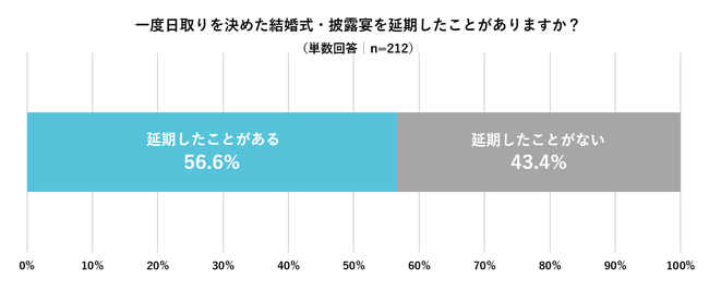 現在、結婚式・披露宴の日取りを決めていると回答した男女212人に、一度日取りを決めた結婚式・披露宴を延期したことがあるかを質問したところ、56.6%が「延期したことがある」と回答しました。