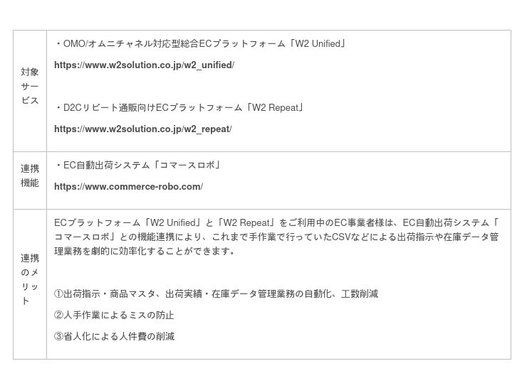 【DX推進】W2 Unified/W2 RepeatがEC自動出荷システム「コマースロボ」と連携開始