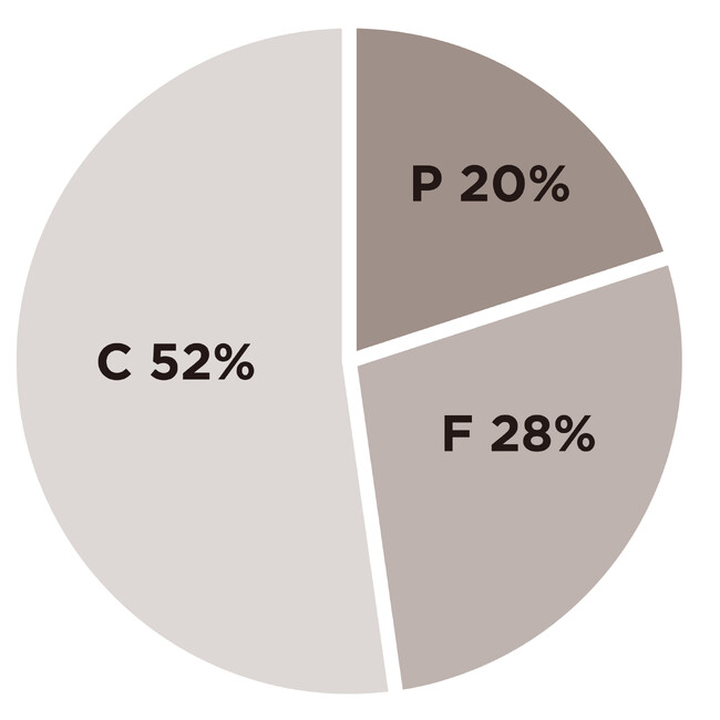 ココアパウダーを由来とする食物繊維に加え、イヌリンとグァーガム分解質の水溶性食物繊維ブレンドを配合。400kcalあたり合計6.2gの食物繊維を供給します。