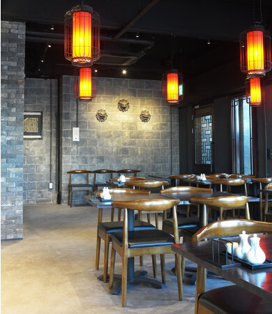 「島中華 蒸籠工房」の玄関には窯元 やちむん家 新垣光雄氏が作成したシーサーと龍がお出迎え、店内は黒いレンガ調の壁が印象的な空間です。落ち着いた雰囲気で、ゆっくりと会話を楽しみながら美味しい料理を味わうことができます。また、客席は22席と個室8席があり、観光・接待・記念日などのプライベートなシーンにも最適です。