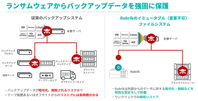 Rubrikは、オンプレからクラウドまであらゆる環境をサポートしているDX時代のためのデータ管理プラットフォームです。ランサムウェア対策としても注目されています。
