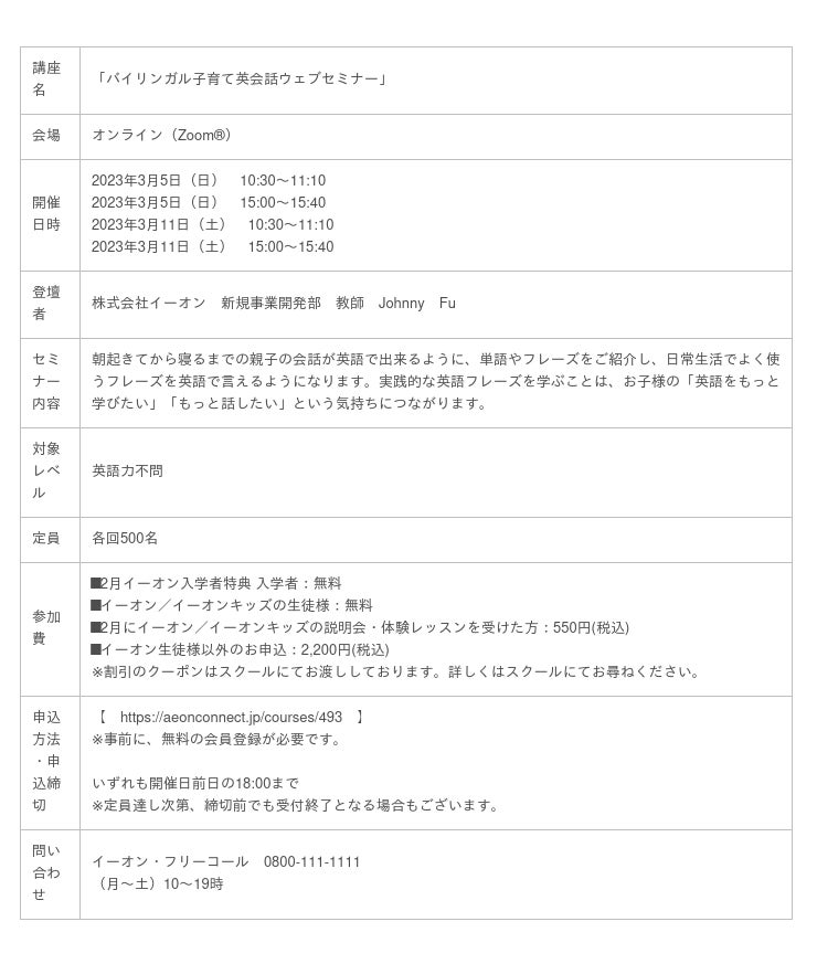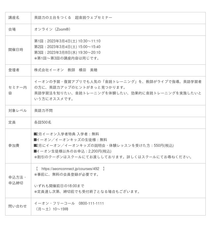 他にも、イーオン教師による「英語の土台をつくる超音読セミナー(開催日:3月4日、3月8日)」「バイリンガル子育て英会話ウェブセミナー(開催日:3月5日、3月11日)」など、英語学習に役立つ内容を伝えるセミナーも開催します。日々の英語学習や子育てに役立てたいと思っている大人の方もお子様や保護者様も一緒に楽しめるセミナーとなっています。